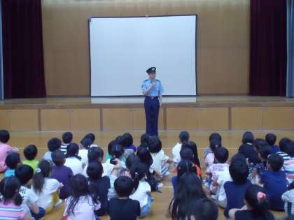 避難後,右京警察署の方に,登下校時に注意することや不審者に出会った時の逃げ方などを教えていただきました。