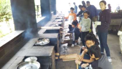 午前中の活動は,野外炊飯です。カレーを作っている様子です。食材を切るところから火をおこしてご飯をたいたり,カレーを煮込んだりと班のみんなで協力して作っています。
