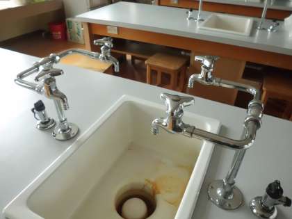 りかしつは,おもに 3年生いじょうの人が りかの じっけんを するときに つかいます。いろいろな どうぐが おいてあります。グループで じっけんが できるように うえの しゃしんのように じゃぐちのついた ひろい つくえも あります。