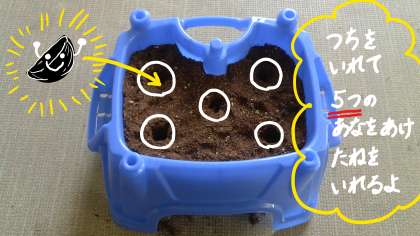 3.「たねを まくいち」に きを つけて,つちに 5つの あなを あける。
