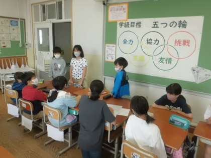 1年生が自己紹介に困っていると,自然と手助けをする6年生の姿がありました。