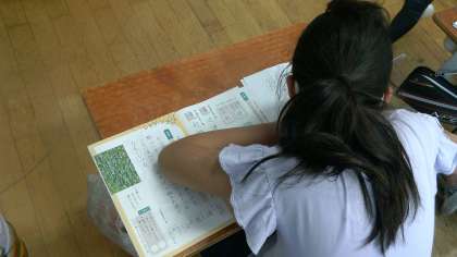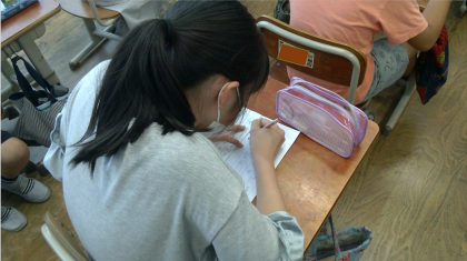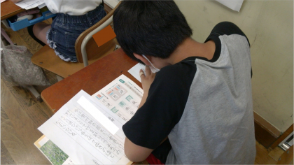 今日の書写の授業では,文字の大きさと行の中心に気を付けて硬筆で『竹取物語』を書きました。