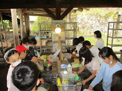 野外炊事では、みんなで協力して調理し、とても美味しい鶏すきが完成しました。食事の後の片づけも手際よく、所員さんにも褒められていました。