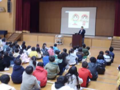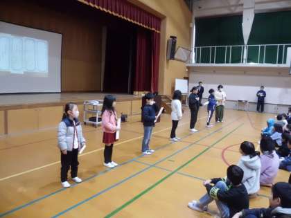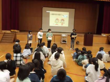 人権朝会を体育館で行いました。校長先生の話の後、各学年の人権標語や作文、ポスターなどを紹介しました。