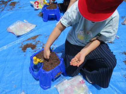 5月22日(水)に生活科「さいてほしいなわたしのはな」の学習でアサガオのたねまきをしました。自分のはちうえ、自分のじょうろをもらい、自分の手で育てるんだという気持ちを高めていました。とてもわくわくしながら土を入れ、たねをまき、初めての水やりをしました。これからも毎日水をあげようとやる気でいっぱいです。これから大切に育ててほしいと思います。