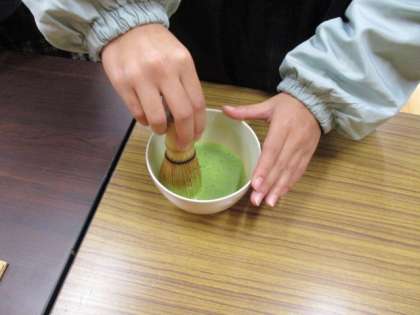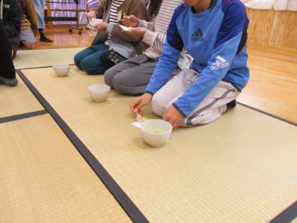 13日(金)茶道体験でお抹茶と和菓子をいただきながら,茶道の作法を学びました。
