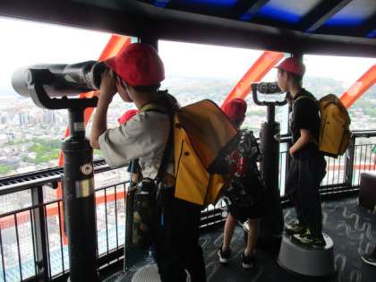 京都駅の大階段上のテラスから、北の方面、西の方面と順番に観察し、山の多さやお寺などいろいろなものを発見できていました。京都タワーの展望室でも、目に入るものすべてにわくわくしながら、「高速道路が見えた!」「鳥居があったで!鳥居!」と教えてくれました。