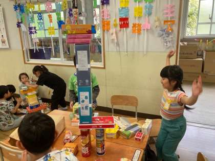 算数科の「いろいろな かたち」では、集めたいろいろな形の空き箱などを使って、動物や車作りをしました。グループの友だちと話し合い、協力しながら作っていくことができましたね。