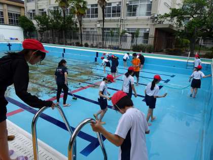 6月4日(水)にプール清掃がありました。6年生という責任感も持ちながら、一生懸命掃除に取り組むことができました。最初はドロドロだった床も、6年生の頑張りのおかげでピカピカになりました。