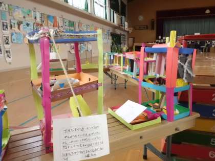 子ども達の力作がそろいました。作品を観ていると,一人一人の思いが伝わってきます。子ども達も自分の作品は気になるのですが,それ以上に友達や他学年の作品をじっくりと観て,作り方や発想のよさに気づいているようです。