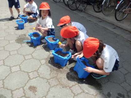 水をやりすぎないでね。と先生が話している中で,ばしゃばしゃと水をかけている子が。聞いてみると「早く芽がでてほしいな。」との気持ちだそうです。その気持ち,よくわかります…。