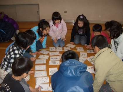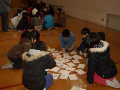 2月2日の2校時に体育館で「かるたとり大会」をしました。たてわりグループで低学年にはハンディーをつけながら行い,みんなで楽しくかるたとりをしました。
