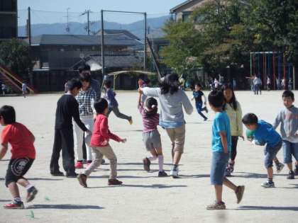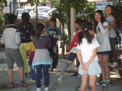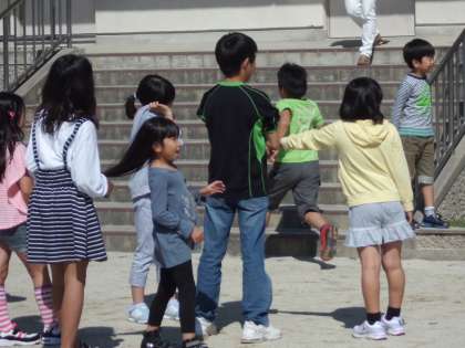 低学年の子どもが高学年の子どもにぺたっとひっついて,頼っている姿。とってもほほえましいです。頼りにされている高学年。まんざらでもない様子で,あれこれとお話をしています。この姿もほほえましいです。