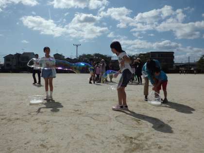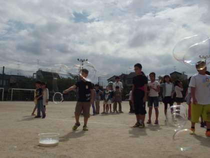 そして,イベント当日。秋空にとっても大きなシャボン玉が浮かびあがりました。参加した子ども達は,みんな大喜びでした。