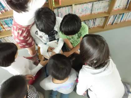 最後は,低学年の子どもが身を乗り出し,一冊の本にかぶりつくようにして,みんなで「ウーン?」と考えていました。