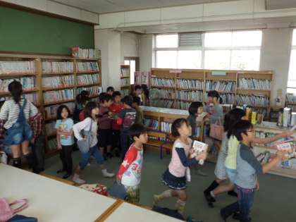 低学年が楽しみにしていたイベント。宝本さがしです。本の情報をいろいろ教えてもらってその本を探し出すというもの。