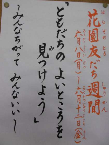 また,本校には人との望ましい係わりを築いて,自分らしく生きていく力をつけていくことを願って「花園友だち週間」を設定しています。今回は,「ともだちの よいところを 見つけよう」です。「みさきの家」での野外活動を通して,子どもたちは友だちのよいところをたくさん見つけたことでしょう。友だちと力を合わせて努力することで友だちのよいところに気づき,さらに仲良くなっていくことができます。今回の花園友だち週間をきっかけに,どの子も友だちのよいところや頑張りを見つけ,よりよい集団として高まっていってほしいと思います。