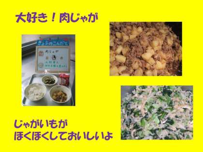 肉じゃがは人気メニューのひとつです。じゃがいもはほくほくして, たまねぎはやわらかく, この季節新じゃがいも, 新たまねぎはおいしいですね。