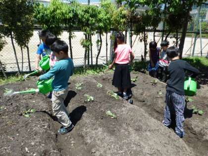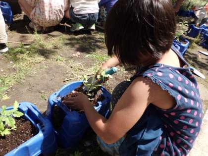 とってもいい天気の中,一人一鉢のミニトマトを植えました。大きく育つように,毎日水やりをして,がんばります。
