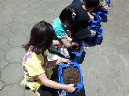 土を入れて,指で小さな穴をあけて,一粒ずつ丁寧にたねを入れます。そうっと土をかけて,「早く芽がでてほしいなあ」とかわいい声が聞こえます。