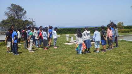 北淡震災記念公園ではまず慰霊碑の前で集会をしました。先生のお話を聞いて黙祷をしたあと折鶴を捧げました。