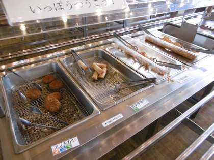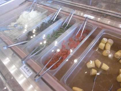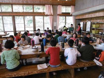山の家での最初の食事です。カレーライスかラーメンの好きなほうを選びます。そして,山の家のお楽しみバイキングです。バランスよく食べましょうね。