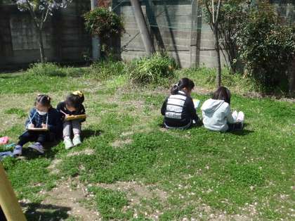 校庭のいろいろなところで春をみつけて,近づいてしっかり見てみたり,色を塗ったりしていました。