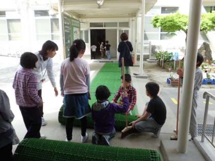 花園小学校のみんなの力を合わせて,今年からきれいになった校舎を掃除しています。