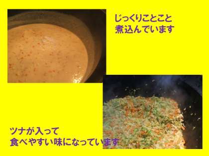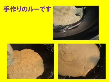 給食のシチューのルーは, バターと小麦粉からの手作りのルーです。じっくり炒めて煮込んだ野菜とともにさらに煮込み, とても深い味わいになります。ほくほくしたじゃがいもをたっぷり使いました。