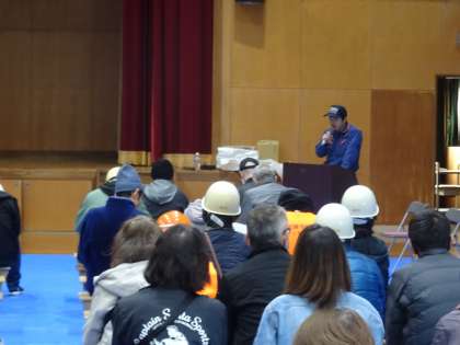 震度6強の大地震が発生し、花園学区においても家屋の倒壊などが発生したと想定し、「地域の集合場所」である花園小学校体育館に集合という内容でした。当日は地域の皆様182名の参加があり、各種訓練に取り組みました。自主防災会の会長様からは、避難所は作ってもらうものではなく、自分たちで協力して作っていくもであるというお話もありました。