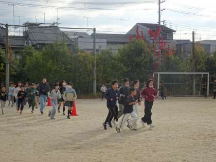 朝の10分間、同じペースで走りきることをめあてとし、無理のない範囲で体力の向上をめざします。子どもたちは軽快な音楽にのせて、元気いっぱい運動場を走っていました。