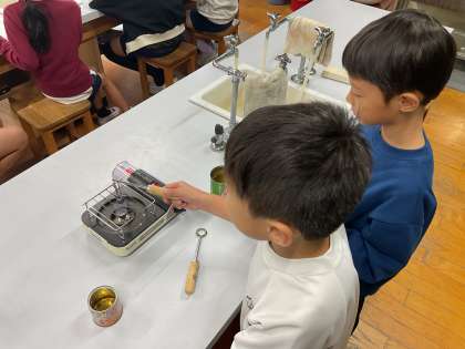 理科「ものの温度と体積」の学習で、金属も温度によって体積が変わるのかを確かめるために実験をしました。鉄球を熱すると、始め通り抜けていた輪っかを鉄球が通り抜けなくなり、子どもたちは驚いている様子でした。