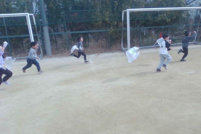 どうやったら高くとばせるか、袋が大きく膨らむかを考えながら、たこを持ってたくさん走り回りました。