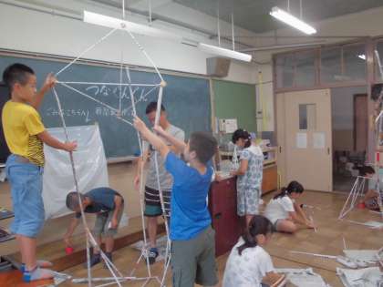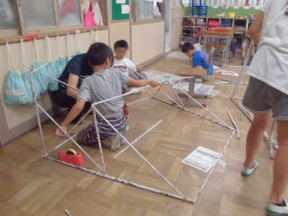 教室をの覗くと4年生が新聞紙を丸めて棒のようなものを造っていました。何になるのか楽しく見ていると,各グループでどんどん立体を造り始めました。新聞紙を丸める人・テープで留める人・つなげた新聞紙を持っている人など役割を分担していました。お城のようなものや,タワーのようなもの。とても楽しくにぎやかな図工の時間でした。