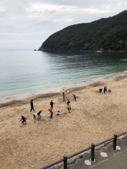 午前中のプログラムは,体育館でゲームの予定でしたが,せっかく若狭の海まで来ているので,砂を使って造形活動をすりうことになりました。