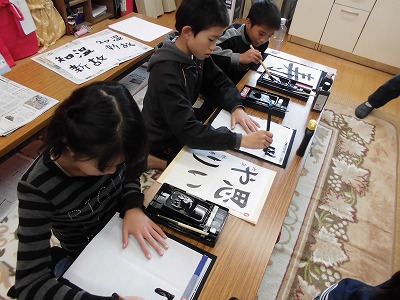 佐藤先生と近藤先生にご指導いただき,お手本をもとに,1年生から6年生まで思い思いの文字を書くことができました。