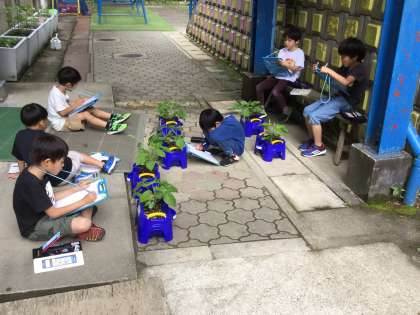 「つるが伸びているなあ」「早く花が咲いてほしいなあ」と感想に書く子どもたち。