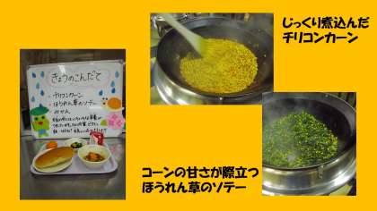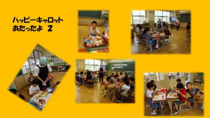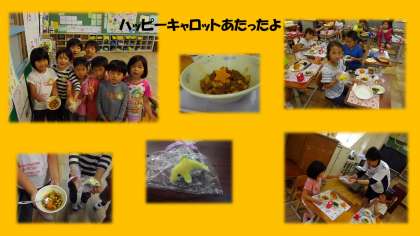 今日はハッピーキャロットです。チリコンカーンに星型のにんじんを入れました。教室からは, 「おめでとう」の声と拍手の「パチパチ」が聞こえてきました。当たらなかった子どもたちも, 一緒になって喜んでいました。