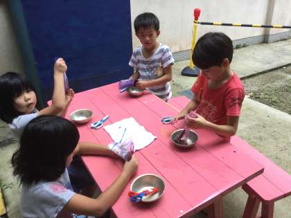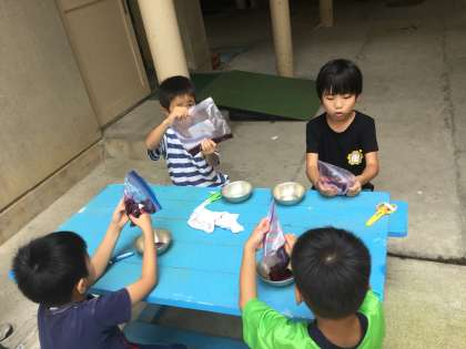 夏休みに集めたアサガオの花を使って色水遊びをしました。