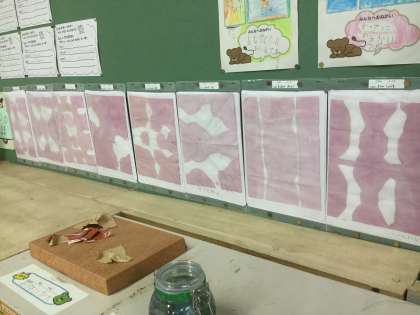 アサガオの色水で染めた紙の中から1枚選んで教室に掲示しました。すてきな作品が並んでいます。