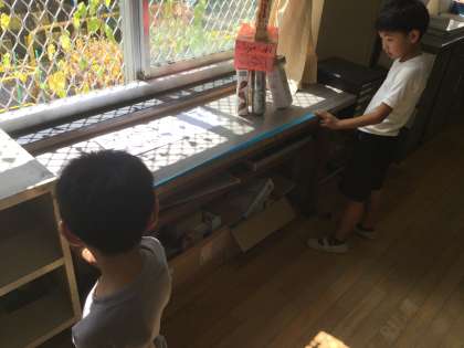 机と扉を見比べて,予想を立てた後,紙テープで机の幅を測り,それを扉の幅と比べました。結果は,外に出せるです。