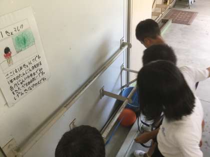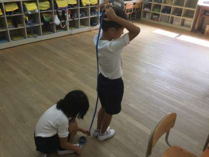 その後,自分の身長と同じ長さの紙テープを,学校のいろいろなものと比べました。