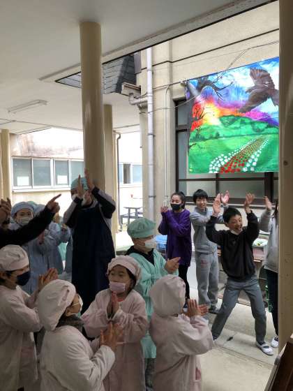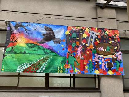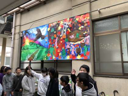 給食室前にアートマイルの絵を飾り,
