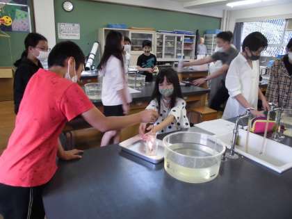 6月10日(水)今日は, 1・3・6年生の登校日です。1年生は, 授業中の発表のしかたの基本(「はい。」と返事をして立ち, 文末に「です。」を付け加えて発表する。)を学習しました。みんな, 「好きな動物は何ですか。」の問いに, 「犬です。」「ねこです。」と, しっかりと答えることができました。3年生は, 教室で卵から育ててきたモンシロチョウや, 今朝校内で採取したオニヤンマの体のつくり(「頭」「胸」「腹」)を観察しました。6年生は, 理科で, 空気の組成について知り, それぞれの気体の中でのろうそくの燃える様子を実験を通して調べました。酸素の中で, ろうそくの炎がぱっと明るく輝くように燃える様子を見て, 新鮮な驚きを感じた子どもたちでした。