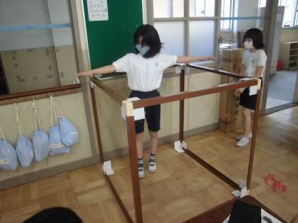 また、教室の中に1立方メートルの枠組みを作り、みんなで1立方メートルを体感してみました。枠組みの中に入って手を広げ自分の体を基準に1㎥を感じていました。