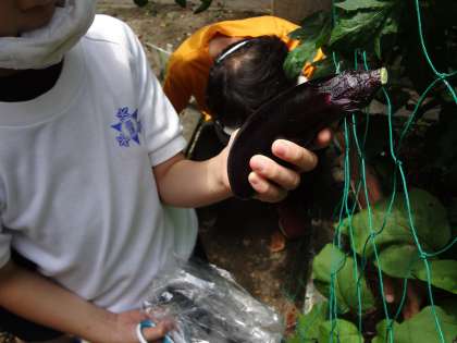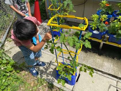 自分たちのミニトマトも,手で触ったり,においをかいだりしながら