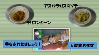 アスパラガスのソテーは, キャベツの甘みと, アスパラガスの食感が楽しめて「おいしい!」と大好評でした。日増しに寒くなってきています。もりもりと食べて, 元気なからだをつくりましょうね。
