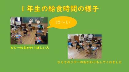 今日は大人気のカレーでした。ルーから作るカレーは子どもたちの大好きな献立です。「おかわりする人」の先生の声に「は〜い」と手をあげていました。ひじきのソテーはミックスビーンズとにんじんが入りいろんな豆の食感を味わえる1品です。1年生も「おいしい」と喜んで食べてくれていました。