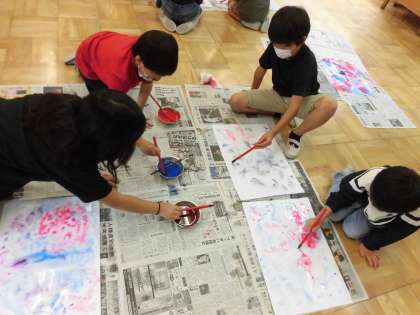 画用紙をたっぷりの水で濡らし,赤・青・紫の絵具で薄く色づけ。