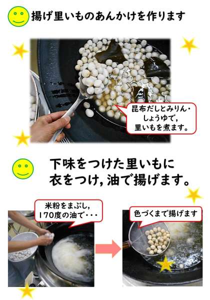 里いもに下味をつけた後に揚げ,教室でそぼろあんをかけていただきます。